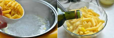 2 加入意面煮10分钟(依产品包装上建议煮制的时间操作)。面捞出后沥干水份,放在大碗中加入5ML的橄榄油搅拌均匀。