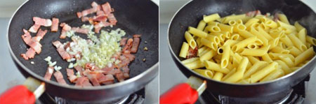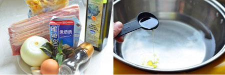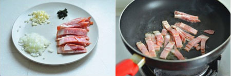 4 培根切成宽度一致的小条,洋葱和蒜切小丁,罗勒切碎。平底锅中加入10ML的橄榄油,约5成热时将培根用中小火炒至出油香味飘出。