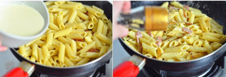 6 将拌好的白酱倒入。调入盐和黑胡椒粉,中小火翻炒均匀撒上罗勒即可出锅,依个人口味可配少许蔬菜色拉一起食用。